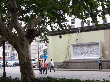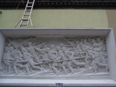 以前来时,门前是幽静的马路,现在已经拓宽一倍多(梧桐树的位置就是原来马路的边际)而且新新增加了照壁,上有人民英雄纪念碑上“金田起义”那块浮雕,俺去的时候还正在刷墙:)