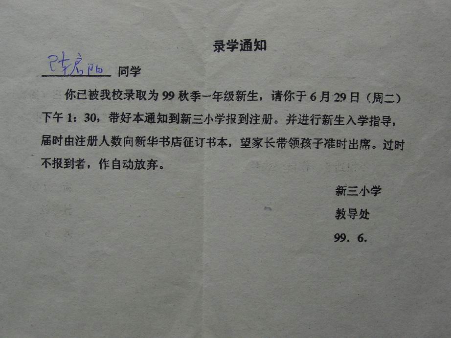 点击浏览详图 (相册号:37662) | | 标题:成长的足迹(6) | 说明:入学通知书来了!阳阳从此成了一名小学生,带着大家的期望,阳阳走进了课堂……