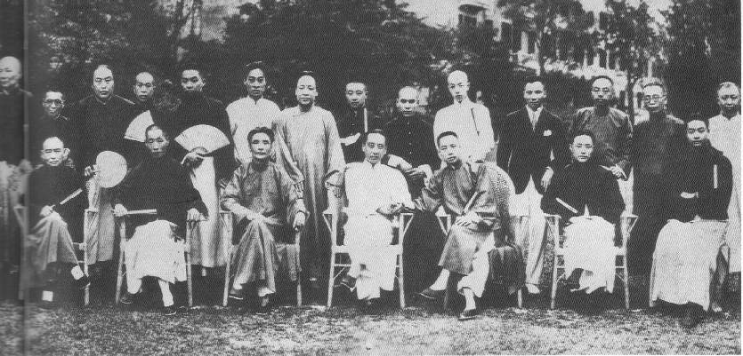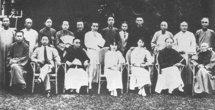 图为1931年6月在上海杜月笙家举办的一次堂会上,杜等社会名流与京剧演员合影。前排左起:荀慧生、梅兰芳、王又宸、雪艳芳、雪艳琴、杨小楼、龚云甫,后排左起:不详、朱某、马福禄、张春彦、张慰如、张某、钱新之、徐碧云、杜月笙、金润泉、王晓籁、虞洽卿(因图片太大,一次不能扫全,这是照片的左半部分,下张图是照片的右半部分) |